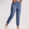 شلوار مام فیت پاره: این نوع شلوار دارای پارگیها و ساییدگیهایی است که به آن ظاهری مدرن و جذاب میبخشد.